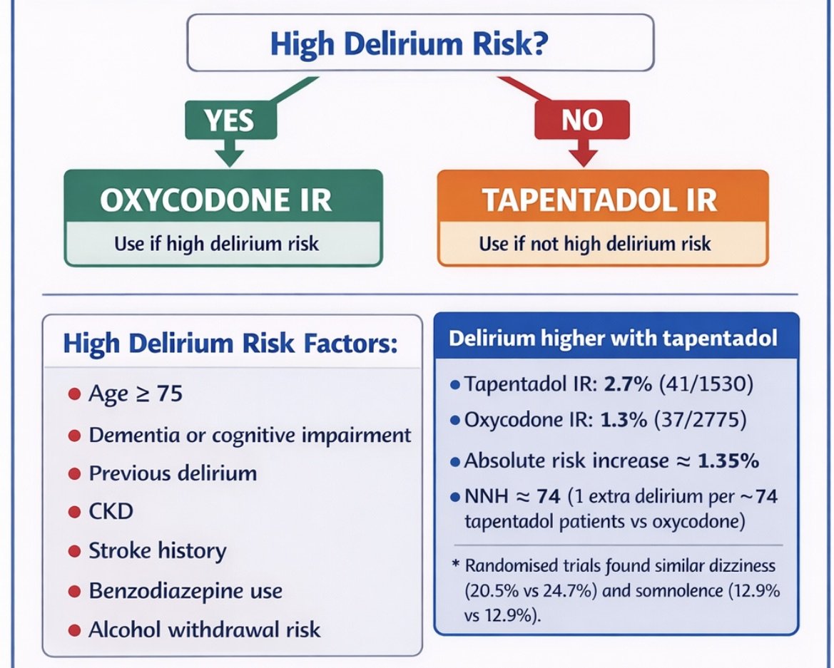 | Liu et al., 2024 | Australian inpatients after surgery (3 tertiary hospitals), propensity‑matched cohorts | Tapentadol vs oxycodone | Delirium; arrhythmias; overall opioid‑related adverse events | Delirium 2.7% (41/1530) vs 1.3% (37/2775) citeturn45view0 | Absolute ↑ ≈ 1.35% → NNH ~74 (approx RR ~2.0). Observational; residual confounding possible. |